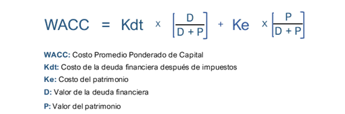 Una vez se determine el Costo del Patrimonio, y el Costo de Ponderado de la Deuda Financiera de la empresa, podemos calcular el Costo Promedio Ponderado de Capital o WACC, así: