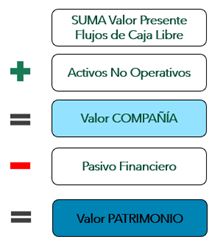 El Valor de la Compañía será el resultado de sumar los valores presentes de los flujos de caja libre más los activos no operativos (Ej.: inversiones en otras sociedades), y posteriormente a este valor le restamos el pasivo financiero de la empresa (de corto y lago plazo), y así obtenemos el Valor del Patrimonio.